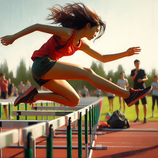 A female athlete is captured in mid-air as she hurdles over a barrier during a track and field event. Her hair flows wildly behind her, highlighting the dynamic motion of the action.
